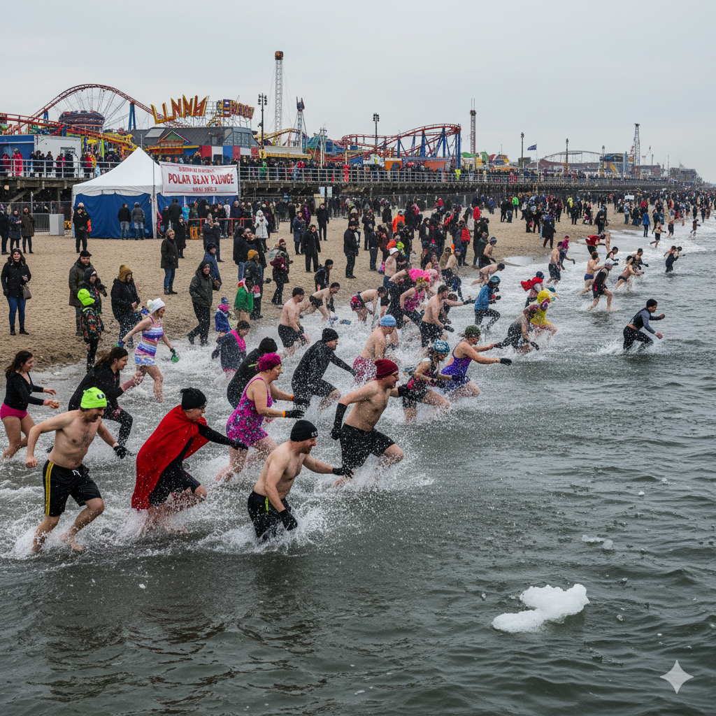 - Le « Polar Bear Plunge » se tient sur la plage, à proximité de la grande promenade (Boardwalk) devant le parc d’attractions Luna Park